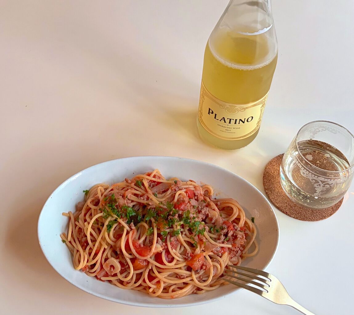 玉ねぎにんにくをもうガタガタに切り、トマト缶とひき肉入れて即席ミートソース完成。