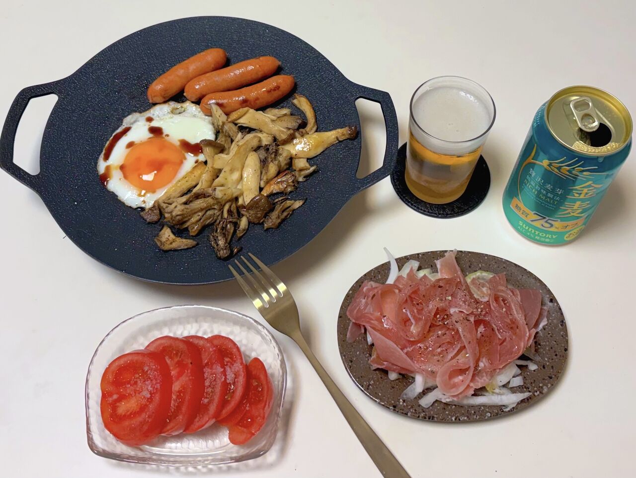 目玉焼き、シャウエッセンパワ辛、エリンギ舞茸ソテー