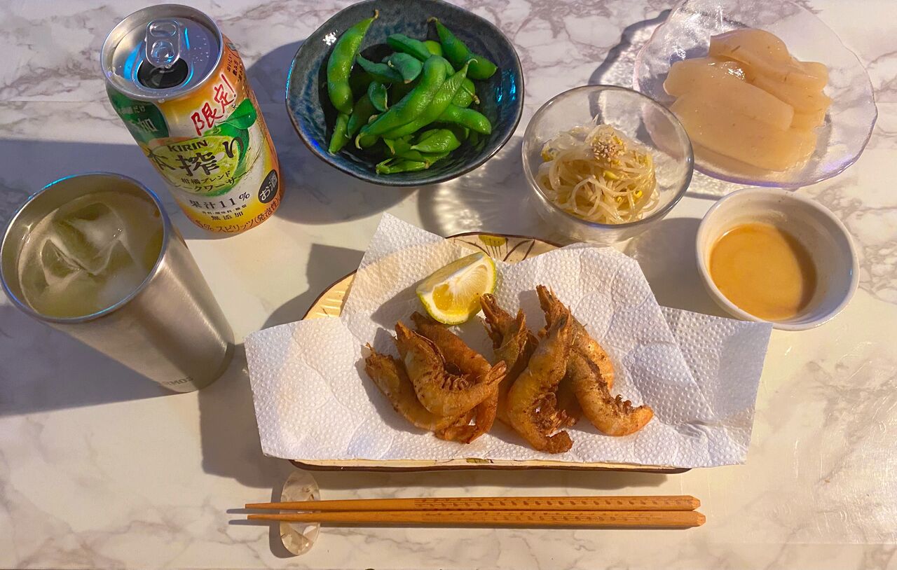 アカシャエビ唐揚げにはかぼすをしぼる。