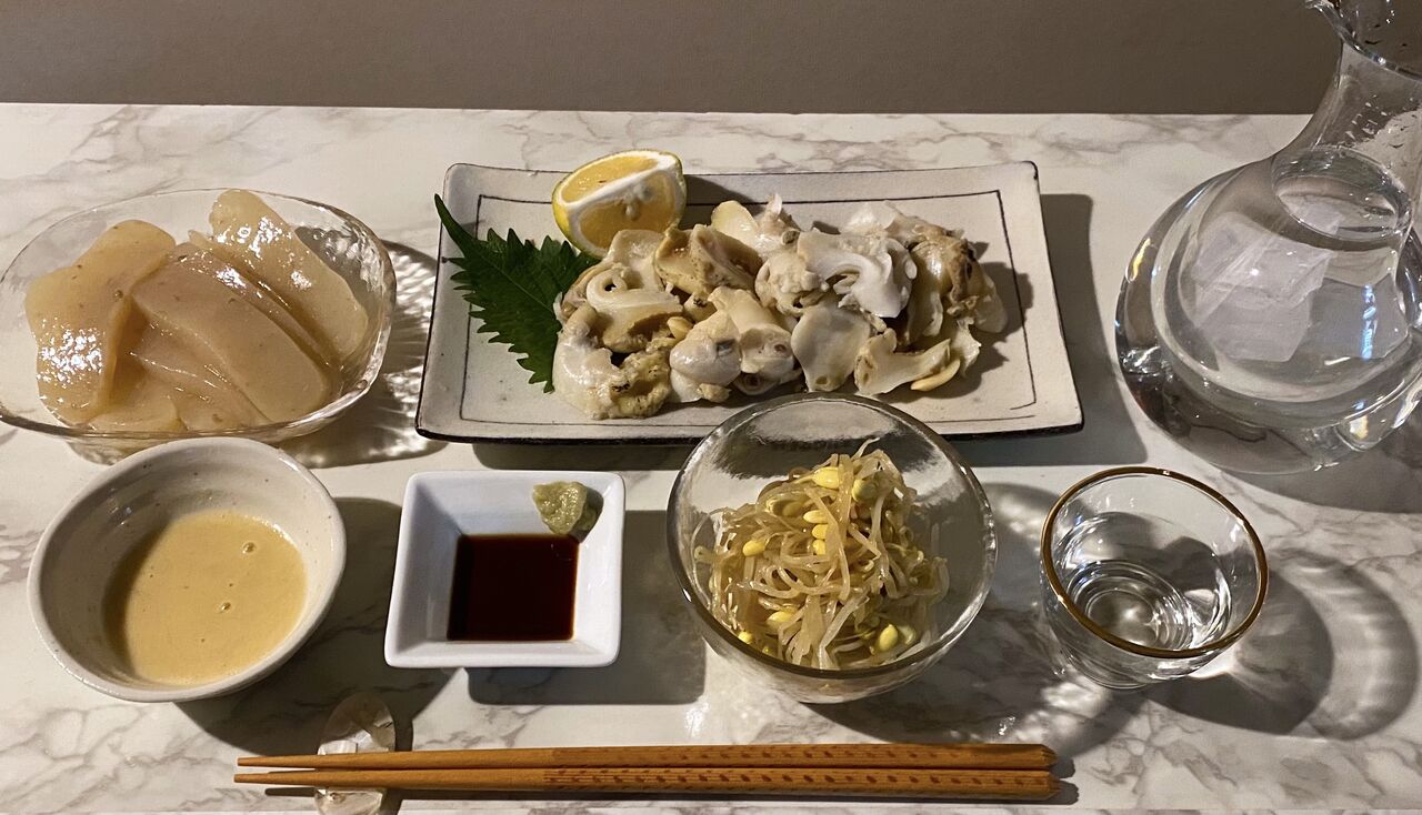 ボイルつぶ貝が半額だったのでうきうきと刺身に。