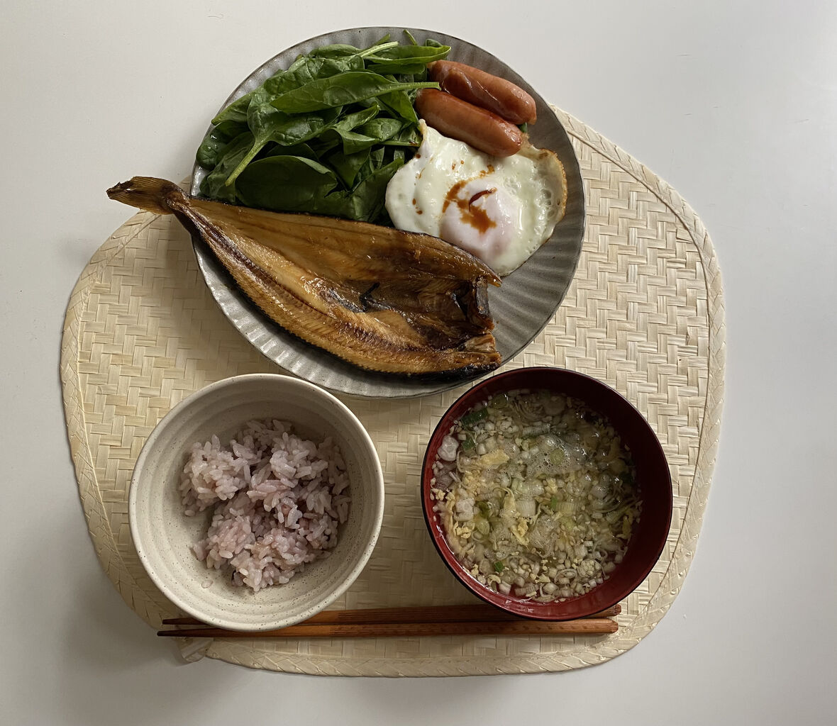 ほっけ干物(まるごとくん)、目玉焼き、ウインナー、ベビースピナッチ