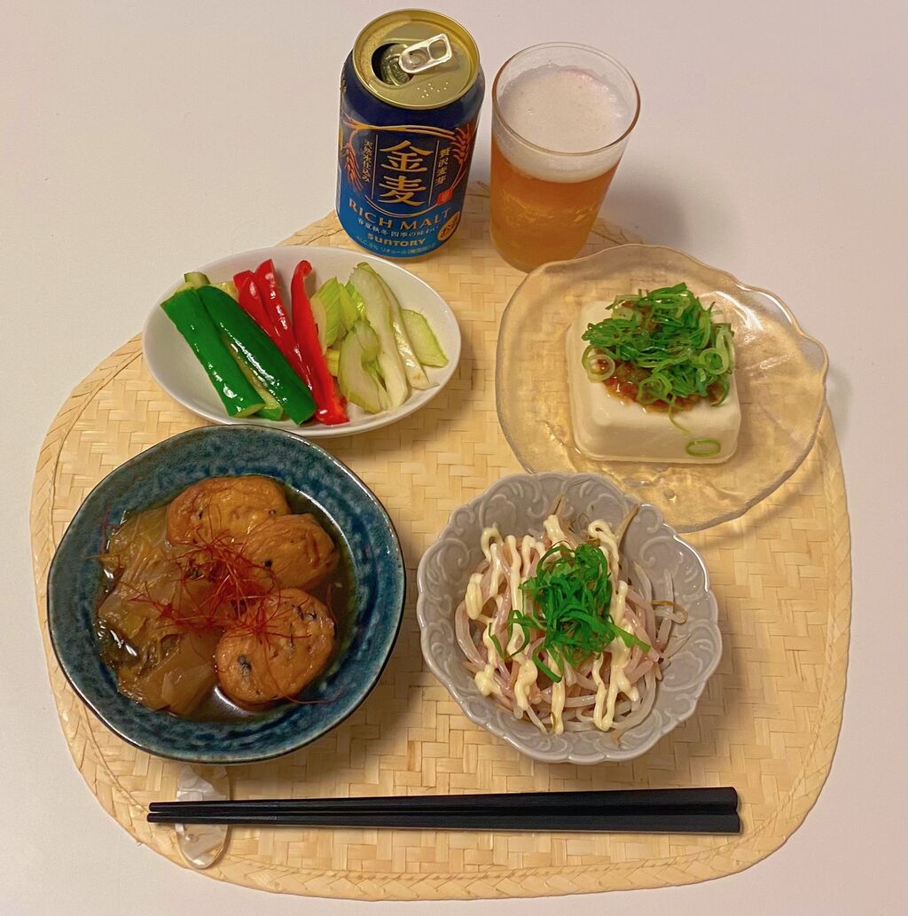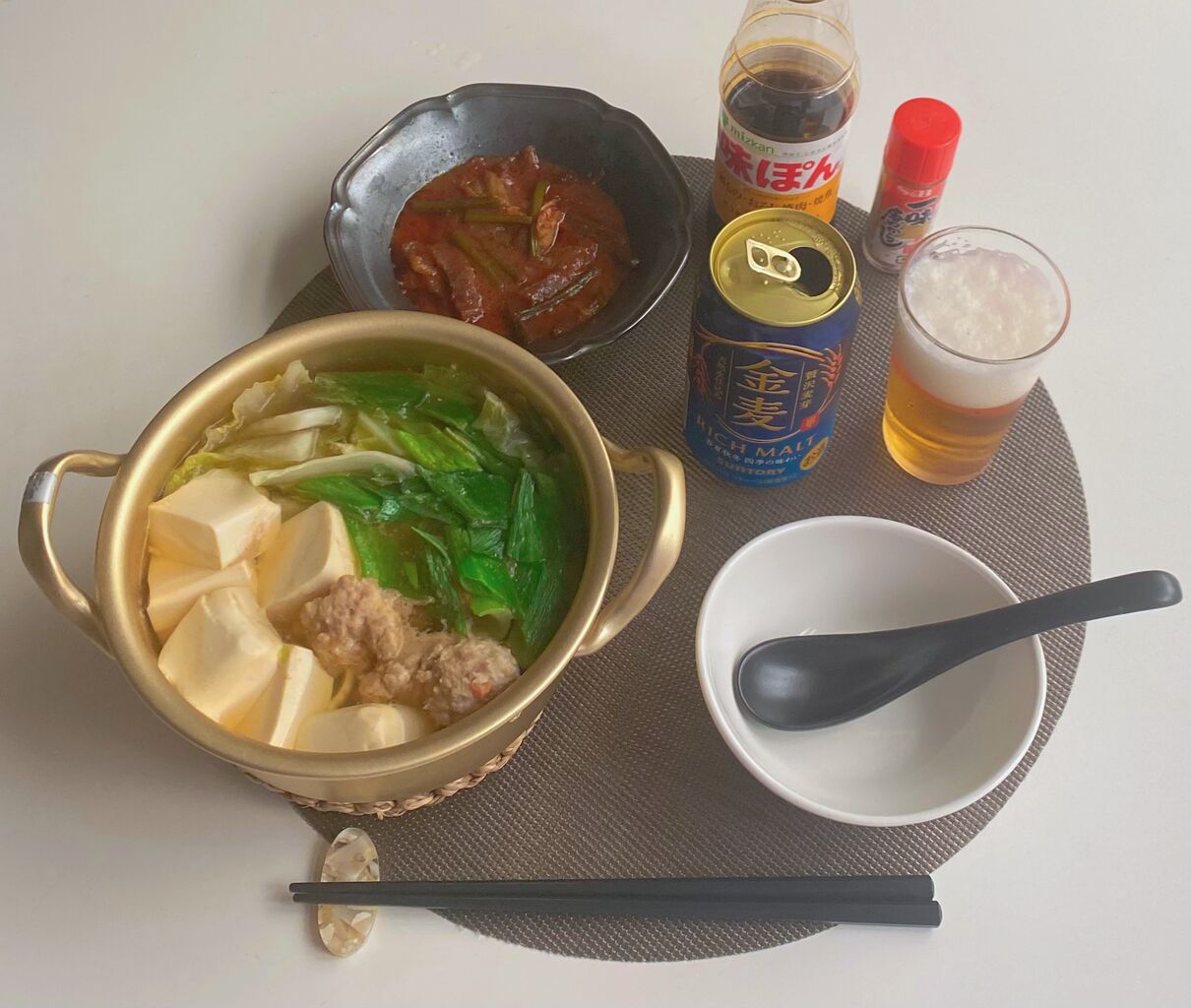鶏つくね、白菜、ねぎ、豆腐をいりこだしで煮た物をポン酢で食べますっ!