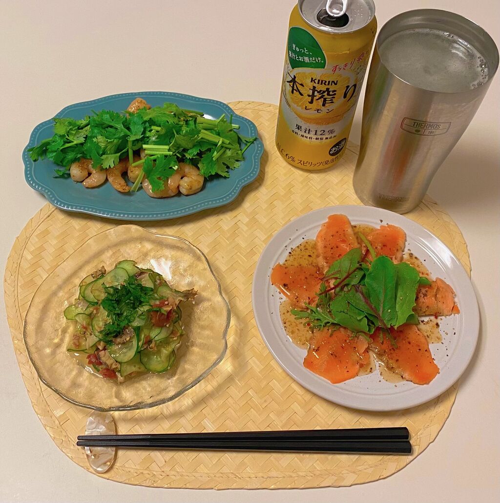 エビとサーモンは帰り道のスーパーで半額で買った物。
