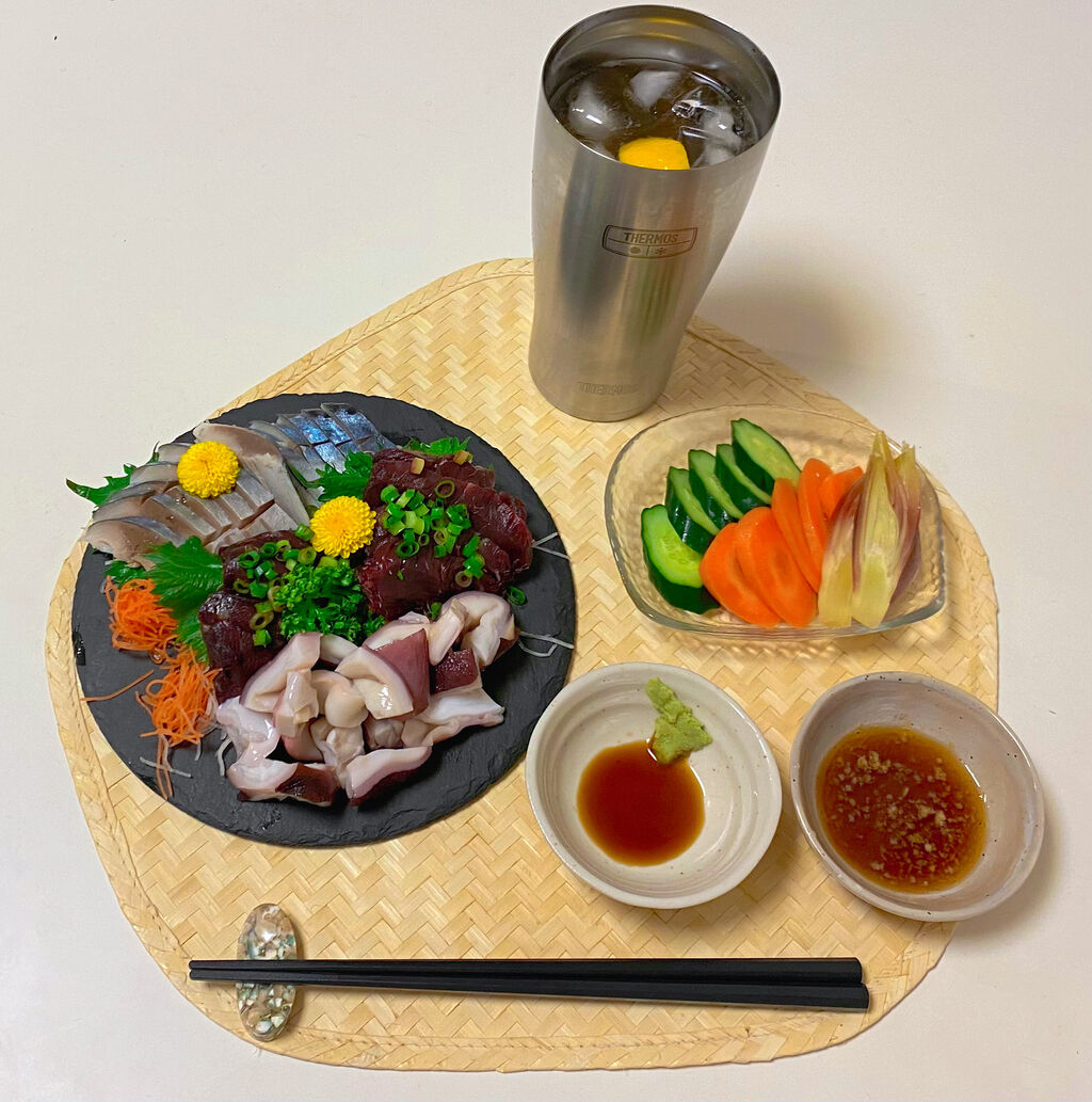 でも夜ご飯はもうスーパーに寄って半額になってた刺身を買いまくってきました。