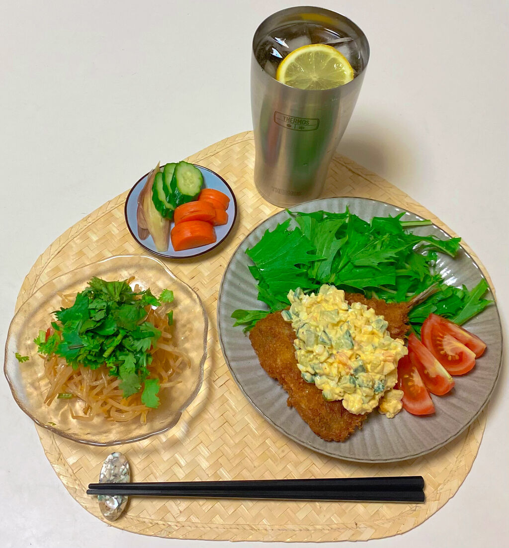醤油と辛子とレモンで食べるのもいいけど久々にタルタルソースでも作るか、と、ピクルスがわりにぬか漬けのきゅうりで代用。