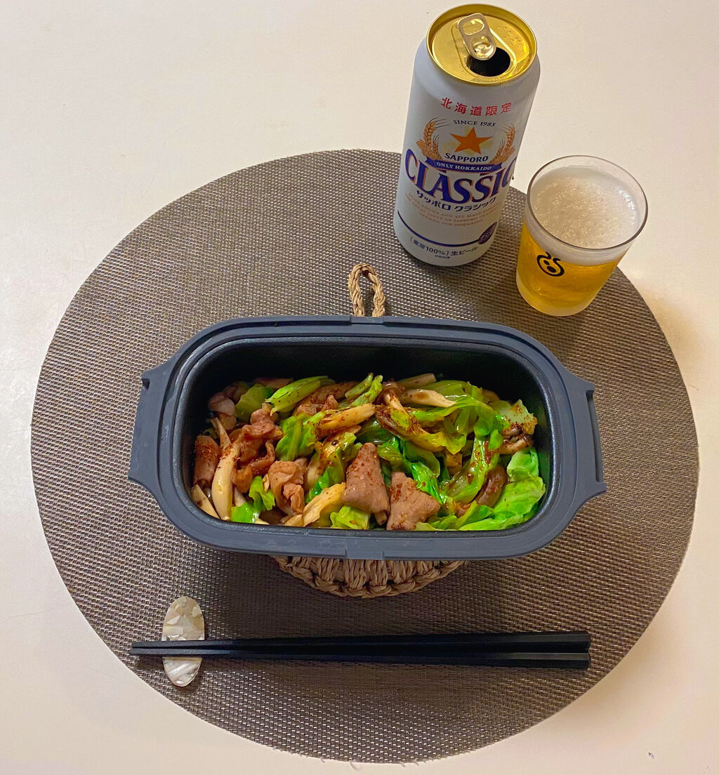 小分け冷凍しておいたホルモン解凍してから調理器に入れて、八百屋さんで買ってきたしめじ、エリンギにキャベツをちぎって入れてチン。