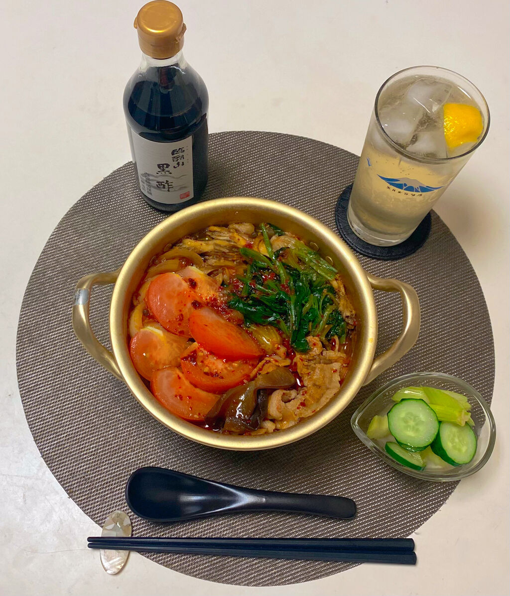 麻辣湯(トマト、きくらげ、舞茸、玉ねぎ、ほうれん草、豚バラ、つきこんにゃく、くずきり)