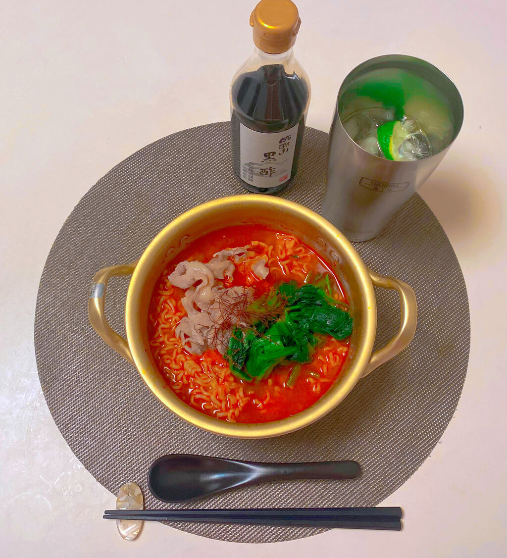 〆は辛味噌インスタントラーメンにさらに麻辣醤とカイエンペッパーを入れた激辛ラーメン。