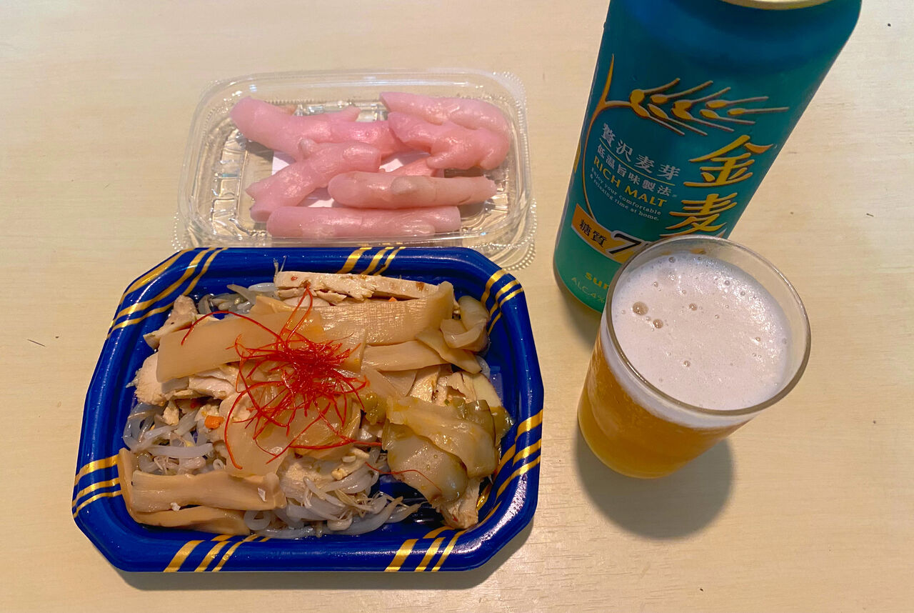 半額お惣菜でキッチン立ち飲みしながら明日以降のご飯のちょっとした仕込み。