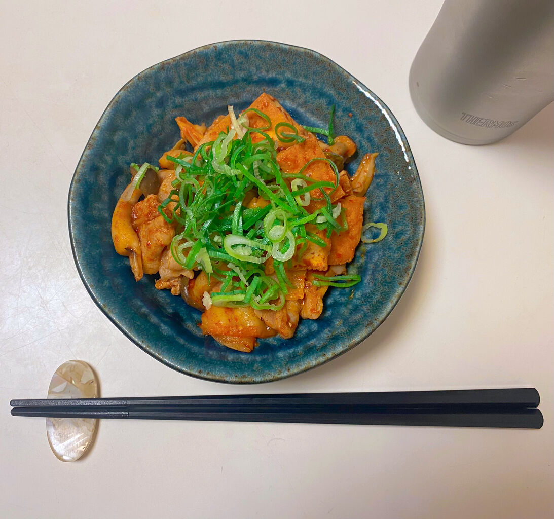 調子上げてレモンサワー飲んでたらつまみが欲しくなって、しめじと厚揚げ入れた激辛豚キムチ