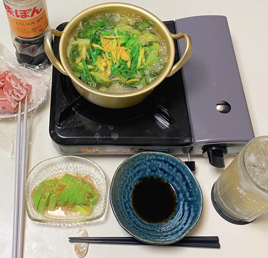 冷蔵庫にある野菜を水に昆布出汁と酒入れていっぱい刻みゆず散らしてポン酢で。
